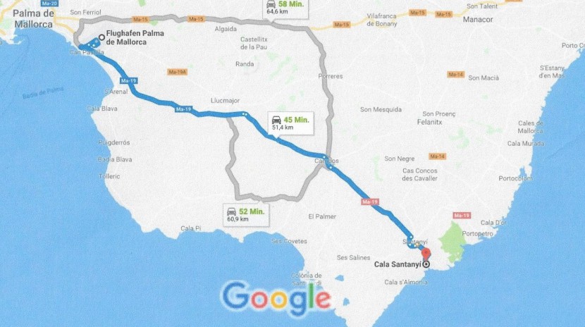 So erreichen Sie die Cala Santanyi mit dem Auto: ca. 50 km in ca. 40 min