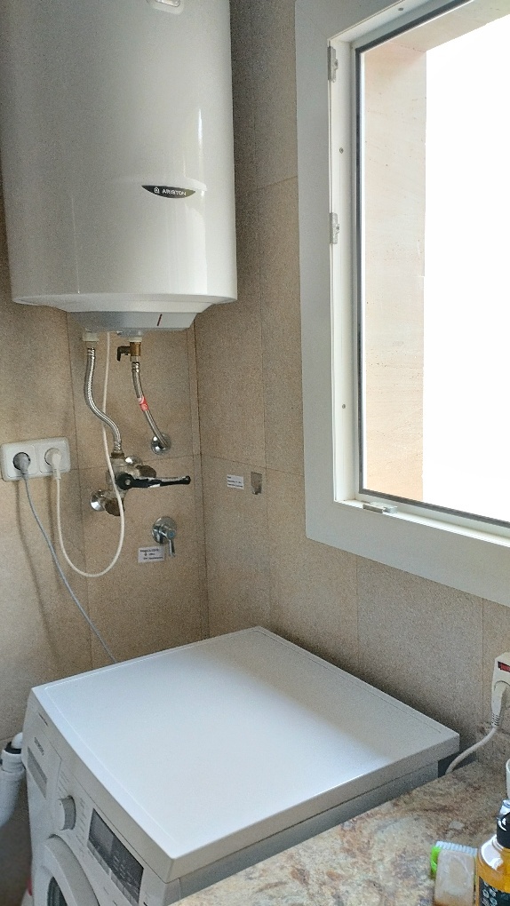 Tageslichtbad mit Fenster und Dusche, Marmorstein-Waschbecken, großem Warmwasserboiler, Heizgerät und moderner Siemens-Waschmaschine