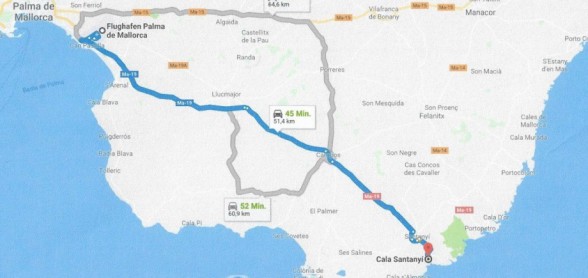 - Fahrzeit ab Cala Santanyi nach Palma Zentrum: