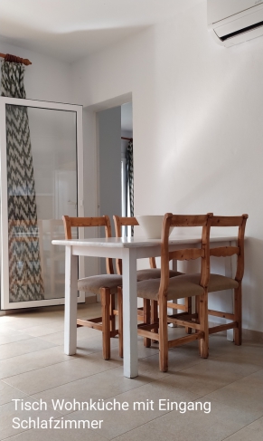 In der hellen Wohnküche steht Ihnen ein Ess- bzw. Arbeitstisch zur Verfügung. Sie können den Raum auch mit den mallorquinischen Vorhängen tagsüber zum besseren Arbeiten etwas abdunkeln.